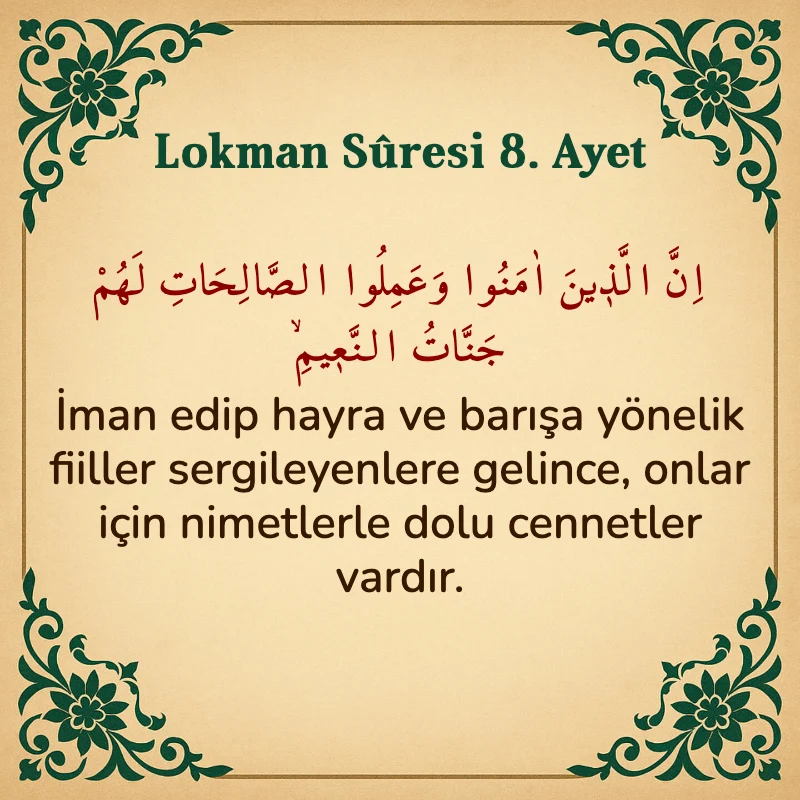 Lokman Suresi 8. ayeti, Allah'a karşı gelmekten sakınan ve bu sayede huzur bulan kimseleri ifade eder. Bu ayette, inananların kalbindeki güven ve mutluluk vurgulanmaktadır.
