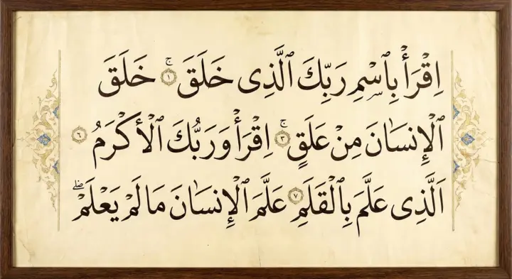 Diyanet İşleri Başkanlığı Meali: “Yaratan Rabbinin adıyla oku! O, insanı “alak”dan yarattı. Oku! Senin Rabbin en cömert olandır. O, kalemle yazmayı öğretendir, insana bilmediğini öğretendir.”