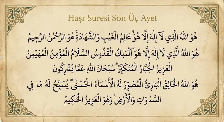 Haşr Suresi’nin son üç ayeti, Kur’an’da Allah’ın isim ve sıfatlarını en yoğun şekilde hatırlatan bölümlerden biridir. Bu ayetler, surenin 22, 23 ve 24. ayetleridir ve genellikle birlikte okunur. Allah’ın ilmi, kudreti, yaratması ve mutlak hakimiyeti bu ayetlerde açık ve etkileyici bir dille ifade edilir. Bu nedenle Haşr Suresi’nin son üç ayeti, hem tefekkür hem de bilinç tazeleme amacıyla sıkça okunur.