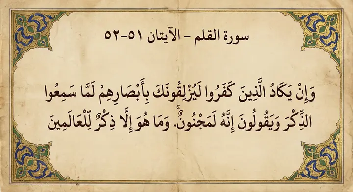 51. Ayet: Ve in yekâdullezîne keferû le yuzlikûneke bi ebsârihim lemmâ semiʿûz zikre ve yekûlûne innehu le mecnûn.