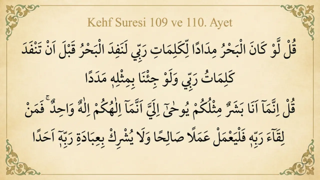109. Ayet: Kul lev kânel bahru midâden li kelimâti rabbî le nefidel bahru kable en tenfede kelimâtu rabbî ve lev ci’nâ bi mislihî mededâ.