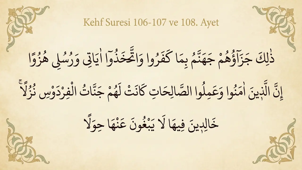 Kehf Suresi’nin son beş ayeti, anlatılan uzun yolculuğun sonunda verilen sakin bir kapanış gibidir. Bu bölüm, 106. ayetten başlayarak 110. ayette tamamlanır ve geriye dönüp bakmayı gerektiren bir duruş sunar. Ayetler hızlıca geçilip okunmaz; çoğu zaman durularak, düşünülerek ilerlenir. Bu yüzden Kehf Suresi’nin sonu, metnin tamamını zihinde yeniden tartmaya çağırır.